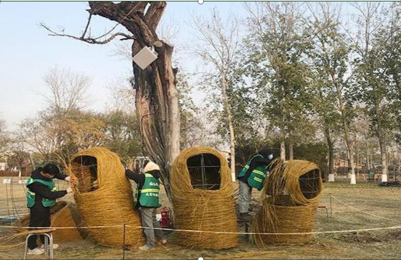 地景藝術(shù)以“生態(tài)環(huán)保、循環(huán)利用、變廢為寶”為理念,以園林廢棄物如柳樹枝、海棠枝、竹枝、桃枝等為主材料,通過設(shè)計(jì)師之手把這些變成了一個(gè)個(gè)栩栩如生的作品,為冬季景觀增色添彩。